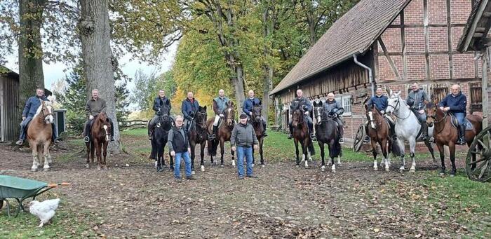 Die Heidereiter auf dem Rehrhof: (von links) Sven Kimm, Uwe Kimm, Karl Gerhard Hage, Manfred Fiedler, Klaus Thomas Tent, Norbert Brüne, Andreas Hocke, Wolrad Herzog, Thomas Westmeier, Heiner Wilke und Otto Emde. Davor stehend (von links) Lutz Gröticke und Helmut Schulz. © Foto: Heidereiter Waldeck/pr