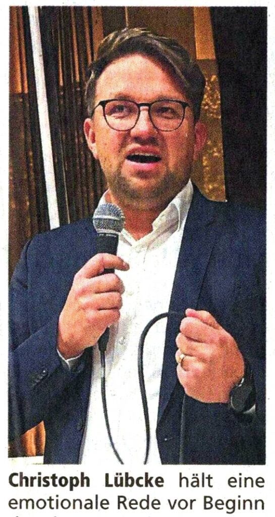 „Demokratie geht uns alle an und lebt von den Menschen“, sagte Bürgermeister Nicolaus Havel, der die Gäste gemeinsam mit der WaJuKu-Vorsitzenden Ute Wiesenberg begrüßte. Er beschrieb Walter Lübcke als einen Mann, der für Haltung, Mut und Demokratie stand. Sehr still wurde es im Saal, als Christoph Lübcke, der Sohn des ermordeten Regierungspräsidenten, mit brüchiger Stimme die schrecklichen Ereignisse am Abend der Tat aus Sicht seiner Familie wiedergab. Es geht eben in dem Theaterstück nicht um eine fiktive Erzählung, sondern um erschreckende, grausame Wirklichkeit.