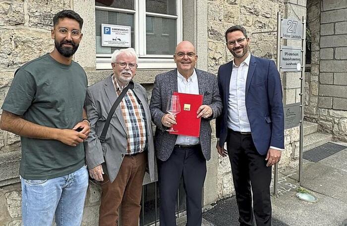 Verleihung des Ehrenglases der SPD Waldeck-Frankenberg: (von links) Latif Hamamiyeh Al-Homssi, Karl-Heinz Stadtler, Dr. Edgar Franke und Dr. Philipp Rottwilm. © Foto: SPD/pr