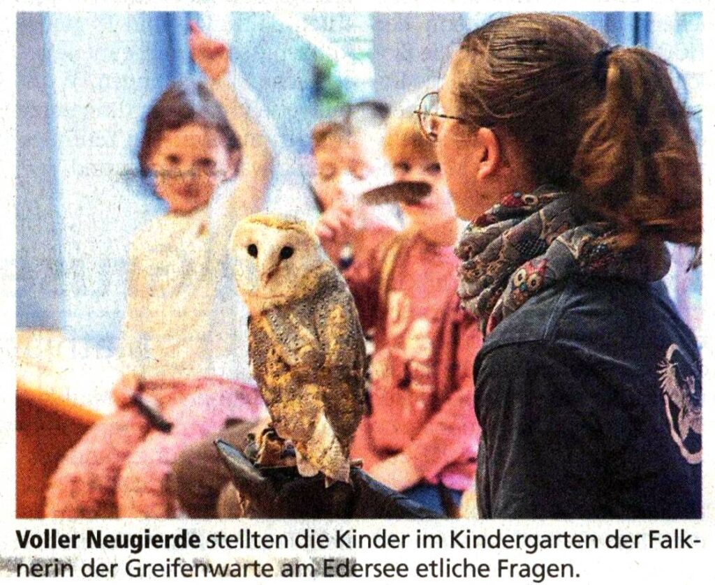 „Wir haben jedes Jahr einen Wettbewerb für die Kindergärten. Dieses Jahr haben wir als Gewinn Falknerin Jana Zulauf gebeten, den Kindern etwas über Eulen zu erzählen“, berichtet Tim Knüppel von der Waldeck-Frankenberger Sparkasse.