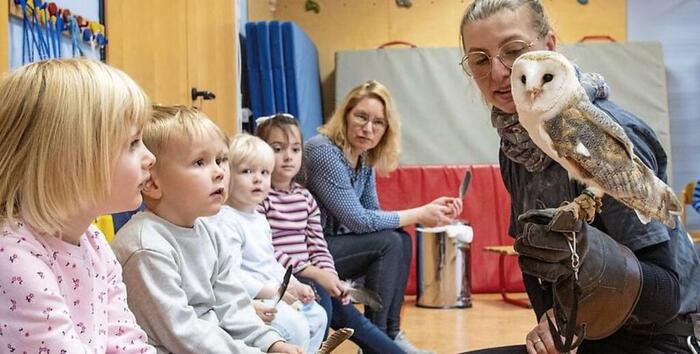 Aufgeregt und manch einer etwas schüchtern, folgt die erste Gruppe der Falknerin in den großen Spielraum. „Maluna ist meine Chefin“, erklärt Jana Zulauf. Die Schleiereule entscheide jeden Tag selbst, ob sie aus ihrer Voliere herauskommen möchte oder nicht. „Heute hat sie sich zum Glück dafür entschieden, mitzukommen“, sagt die Falknerin.