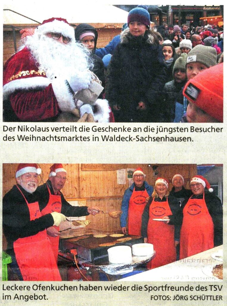 Der Nikolaus verteilt die Geschenke an die jüngsten Besucher des Weihnachtsmarktes in Waldeck-Sachsenhausen.