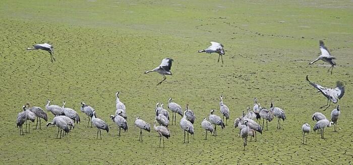Kraniche rasten auf dem Weg in den Süden im Edersee