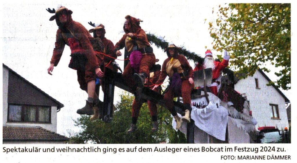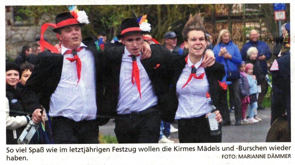 Außerdem legt DJ Steve Ink jede Menge heiße Beats auf. Aber auch die Kaltgetränke in der Sektbar – bereitgestellt von der Festbewirtung Eberle – sollen zu der ausgelassenen Stimmung beitragen. Am Kirmessonntag, 19. Oktober, um 13.30 Uhr startet der bunte Festzug und zieht durchs Dorf. Die örtlichen Vereine, aber auch Gruppen aus den umliegenden Orten beteiligen sich wieder mit garantiert fantasievollen Beiträgen und toll geschmückten Motivwagen. Musikalisch begleitet wird der fröhliche Zug von Gute-Laune-Garant „Volle Kanne Blasmusik“ aus Twiste.