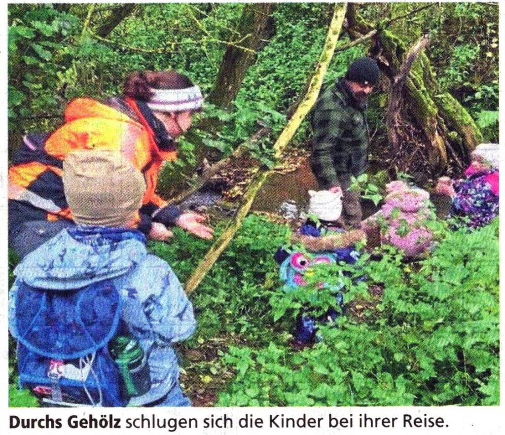 Am Ziel angekommen frühstückten sie erst einmal. Sarah Steinbrück hatte ihren Hund Loki mitgebracht. Außerdem begrüßte Sophie Homberger die Kinder. Sie ist eine Studentin, die momentan ein Praktikum bei der Revierförsterin macht. Sophie hat mit den Kindern das Wasser des „Klingebachs“ erkundet. Dafür wurde ein Glas mit Leitungswasser gefüllt und ein anderes mit Regenwasser. Gemeinsam wurde überlegt, wofür Wasser gebraucht wird und wo das Wasser überhaupt herkommt. Die Kinder erfuhren, dass der Klingebach bei Nieder-Werbe in den Edersee fließt. Sophie brachte den Kindern kleine Gießkannen zum Wasserschöpfen und Lupengläser mit. Es brauchte ein bisschen Mut, Geduld und Kraft, die Uferböschung hinunter und wieder heraufzukommen. Spannend war zu sehen, dass das Wasser aus dem Bach etwas anders aussah als das Trinkwasser vom Kindergarten: Auf alle Fälle war es aber sauberer als das Regenwasser. Sophie hatte ein „Zauberpapier“ dabei: Das zeigt durch seine hell- oder dunkelgrüne Farbe an, wie sauber Wasser ist, das es berührt. Welche Kraft Wasser hat, sahen die Kinder an den runden Formen der Steine, die sie im Bach gefunden haben: Der Fluss hat sie so rund gemacht.